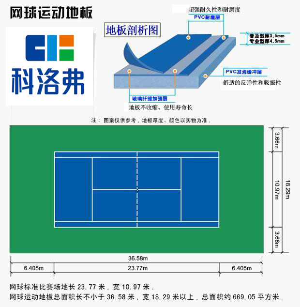 網(wǎng)球運(yùn)動(dòng)最早起源于英國(guó)。由于網(wǎng)球運(yùn)動(dòng)的激烈程度對(duì)地板的耐磨性有很高的要求,PVC塑膠運(yùn)動(dòng)地板具有良好的耐磨性及韌性,能夠很好的勝任運(yùn)動(dòng)員對(duì)地板的要求。同時(shí)PVC塑膠運(yùn)動(dòng)地板具有良好的防滑性,能夠是運(yùn)動(dòng)員的競(jìng)技水平得到極大的提升,同時(shí)由于PVC塑膠運(yùn)動(dòng)地板的良好的減震性能夠很好的保護(hù)運(yùn)動(dòng)員的踝關(guān)節(jié)、膝關(guān)節(jié)等,是運(yùn)動(dòng)員在體驗(yàn)運(yùn)動(dòng)樂(lè)趣的同時(shí)能夠很好的保護(hù)自己。 網(wǎng)球運(yùn)動(dòng)地板板材規(guī)格通覽: 單卷寬1.5m/1.8m 卷長(zhǎng)20m(線內(nèi)) 面層紋理:荔枝紋/寶石紋/沙地紋 總厚度:3.5mm/4.5mm/其他 顏色:天藍(lán)/草綠 場(chǎng)地線總長(zhǎng)寬:23.77mX10.97m 地板總長(zhǎng)寬:36.6mX18.3m 地板總面積:669.78㎡