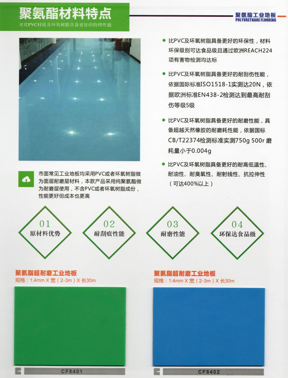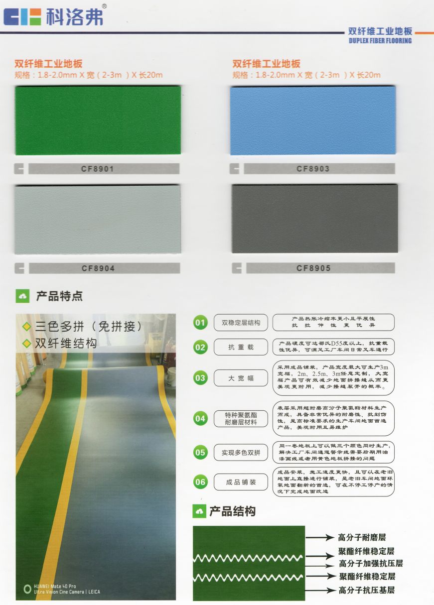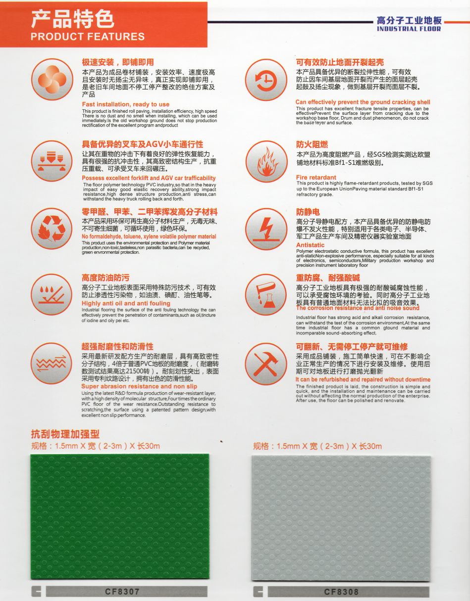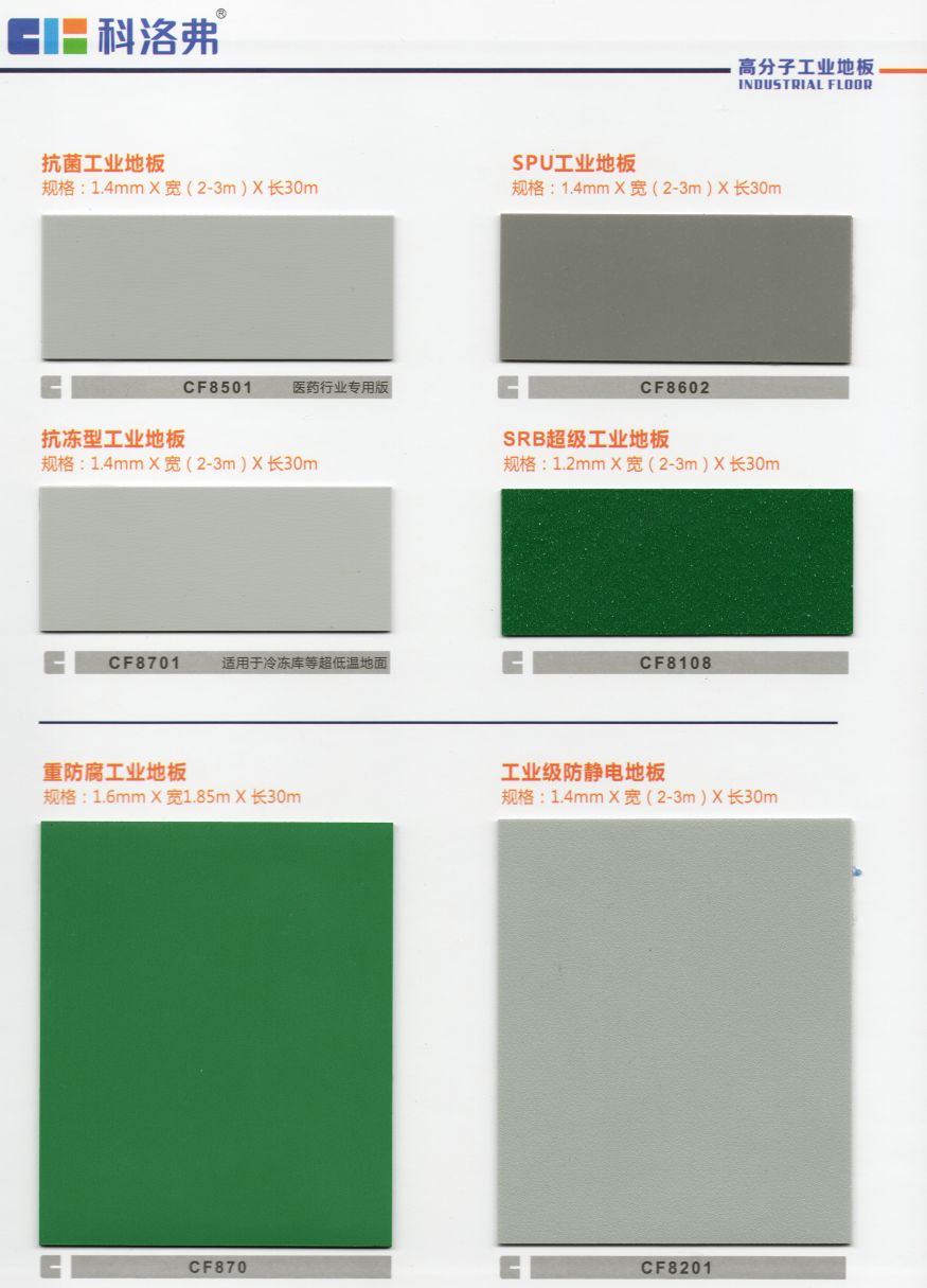 科洛弗高分子工業(yè)地板是一種采用高分子改性樹脂為原材料通過高溫熱壓成型的地板,此地板具備防油性、抗污性、抗腐蝕、防水防潮、施工工期短維修簡單、耐磨性好、抗靜電、重載、能過叉車、環(huán)保無毒、可回收再利用等優(yōu)點!此產(chǎn)品的出現(xiàn)正好填補了市場快速發(fā)展帶來的空白,各項性能指標均衡且優(yōu)異,可以逐步替代部份原有環(huán)氧地坪及各類水泥面工業(yè)地面,應用將逐漸增大,市場前景廣闊。