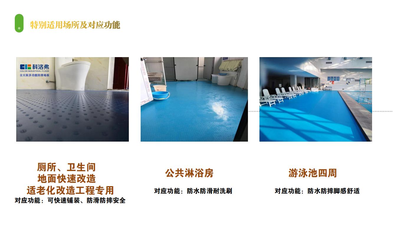 特別適用特點:雙層圓球?qū)@阑鎸釉O(shè)計,加強(qiáng)地面與腳底摩擦力,防止地面因積水打滑。防水防霉抗菌無異味,防摔傷,提供高彈力高舒適性地面感受。